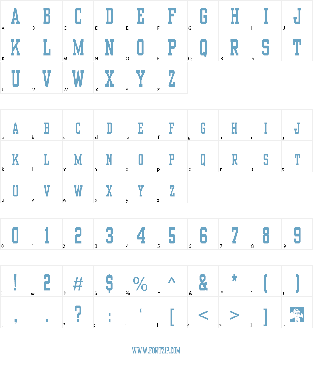 slab-serif font traditionally used on college athletic jerseys or in school yearbooks. It's fashioned after some of the antique wood fonts -- rather blocky, but with character.